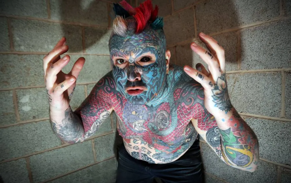 His transformation now includes bold full-face tattoos, tattooed eyeballs (black sclera), ear reshaping, and even nipple removal. Each step pushed his body further into the realm of living artwork, earning him both admiration and controversy.