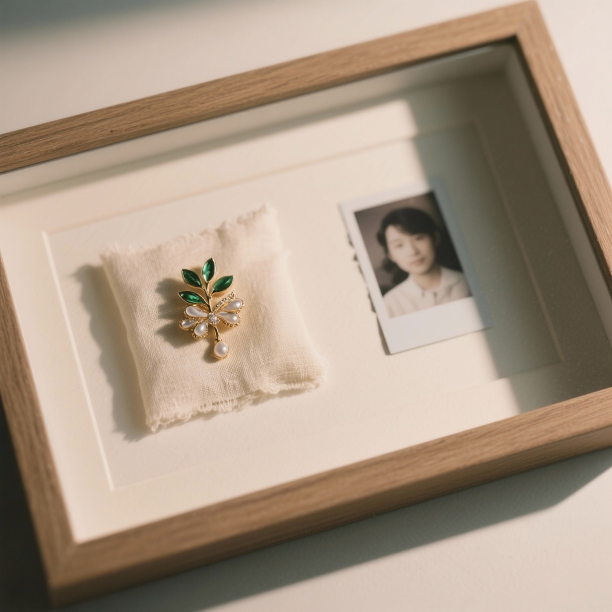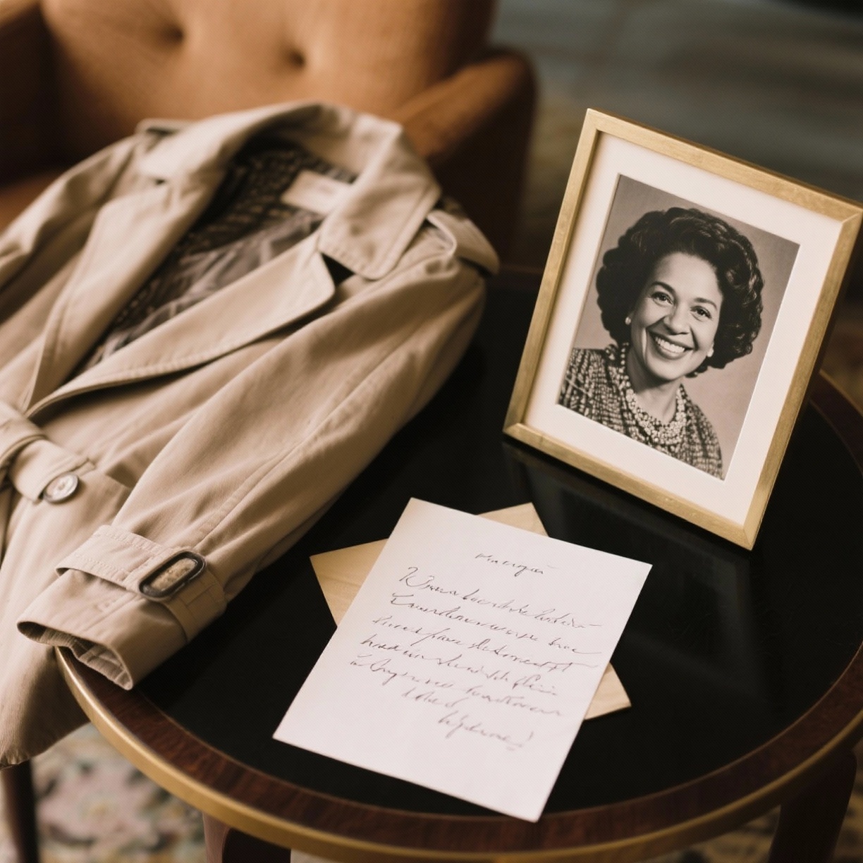 I never tried to restore the coat. Instead, I had a framed shadowbox made—a preserved swatch of the fabric, one of Gloria’s brooches, and a photo of her wearing it. It hangs on my wall now, a reminder that love and lessons outlast things.