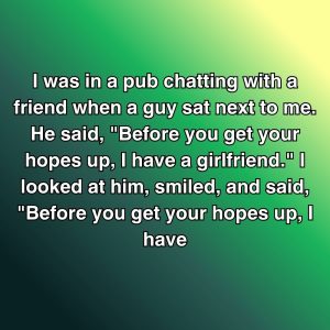 I was at a pub catching up with a friend when some guy planted himself in the seat beside me. His opening line? “Just so you know,…