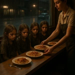 The storm had been pounding the town for hours when Sarah Martinez first spotted them through the rain-streaked window of Murphy’s Diner. Four small figures pressed against…